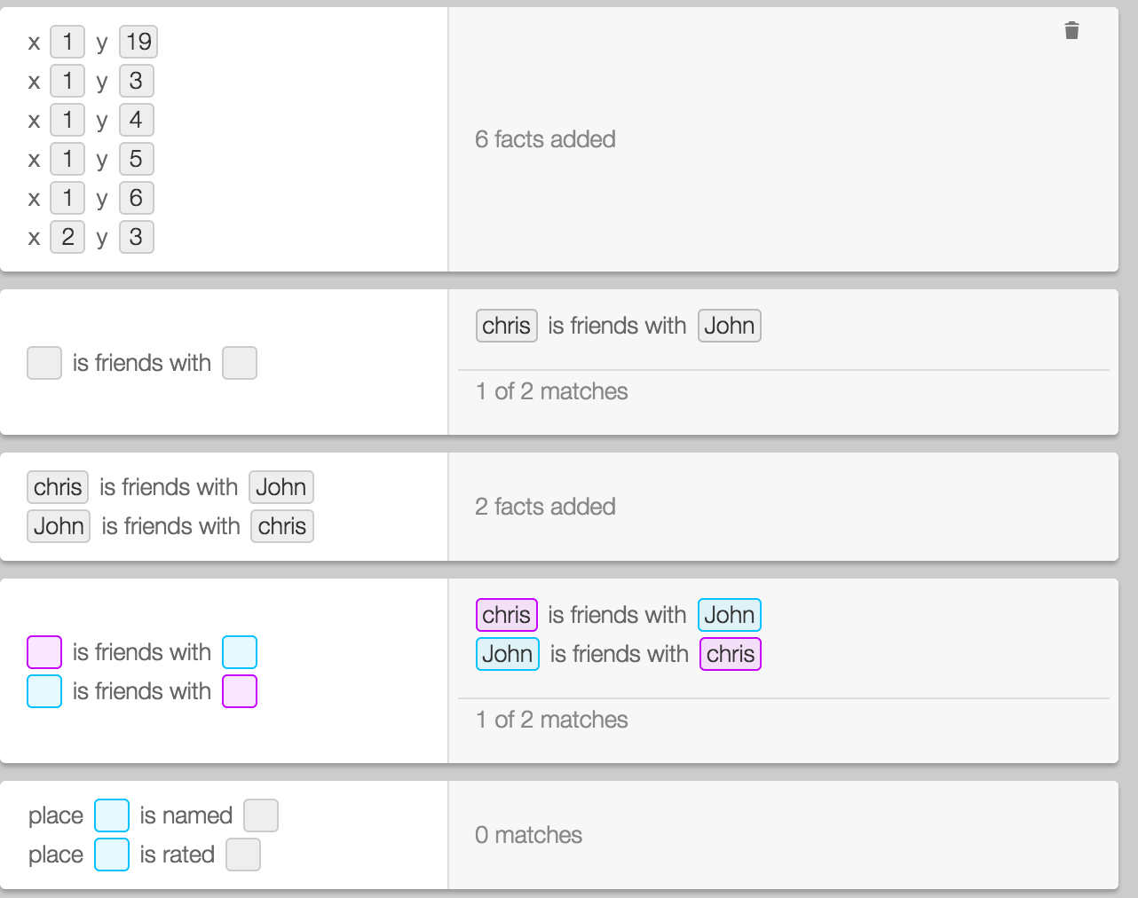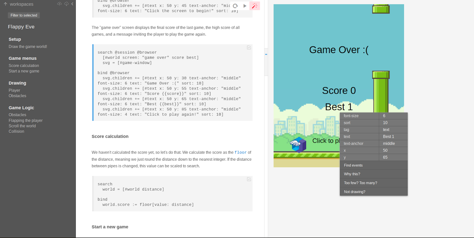 Two years in, they released Eve v0.2 as the first prototype available to the public. It was a browser-based literate programming environment. Despite all of the graphical programming prototypes, Eve v0.2 was a text-based language. It was inspired by Dedalus (from the BOOM Lab), which in turn is based on Datalog, a subset of Prolog.